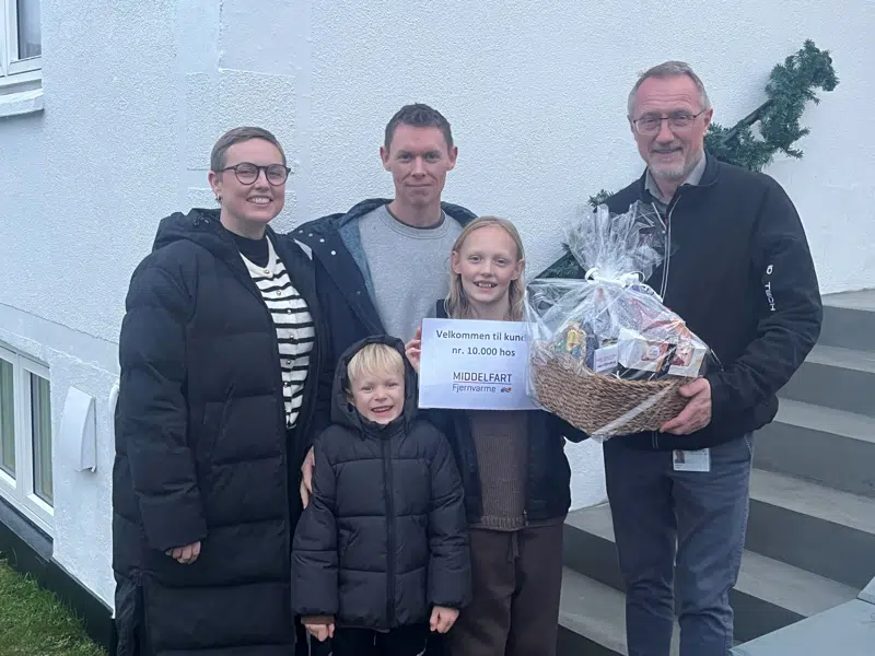 For at fejre denne milepæl har direktør Jesper Skov trodset regn og blæst en kold dag i december, for at overrække en gavekurv til en familie på Vestergade i Strib, nemlig vores kunde nr. 10.000.